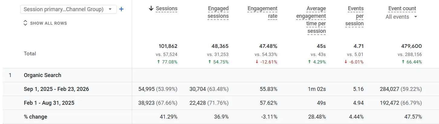 From September 2025 to February 2026, the total number of organic sessions went up to 54,995. Compared to the previous 6 months' session data, which was 38,923, there was a jump of 41.29%. Engaged sessions grew up to 30,704, showcasing a 36.9% increase, indicating improved user interaction via organic traffic. The average engagement time per session became 1 min, 2 seconds from 49 seconds. These results increased content relevance and user engagement quality that contributed to higher traffic from organic search.