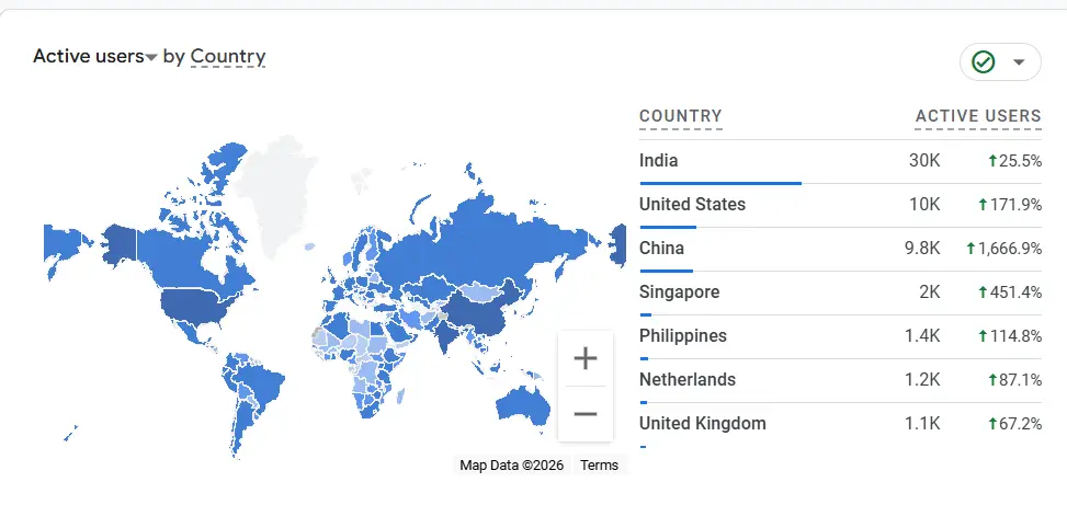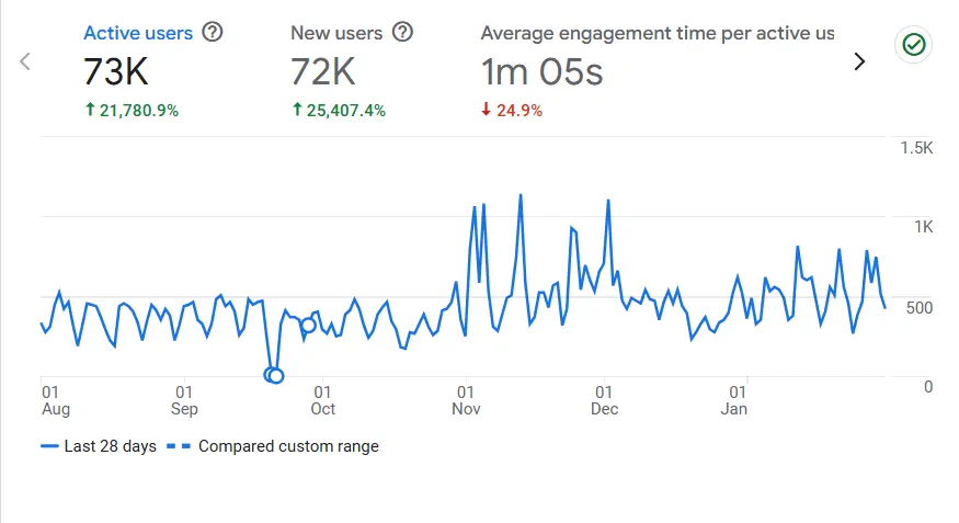 As you can see below, during the 6-month period from August 2025 to January 2026, new users increased by 72k with a 25,407% spike, and the active users grew by 73k with a 21,780.9% increase. This shift indicates a successful traffic expansion on a consistent basis. The average engagement time per active user stood at 1 minute, 5 seconds, showcasing steady user interaction, followed by better visibility and reach.