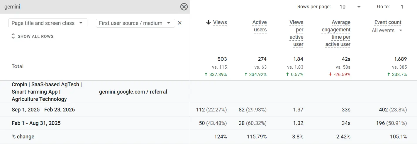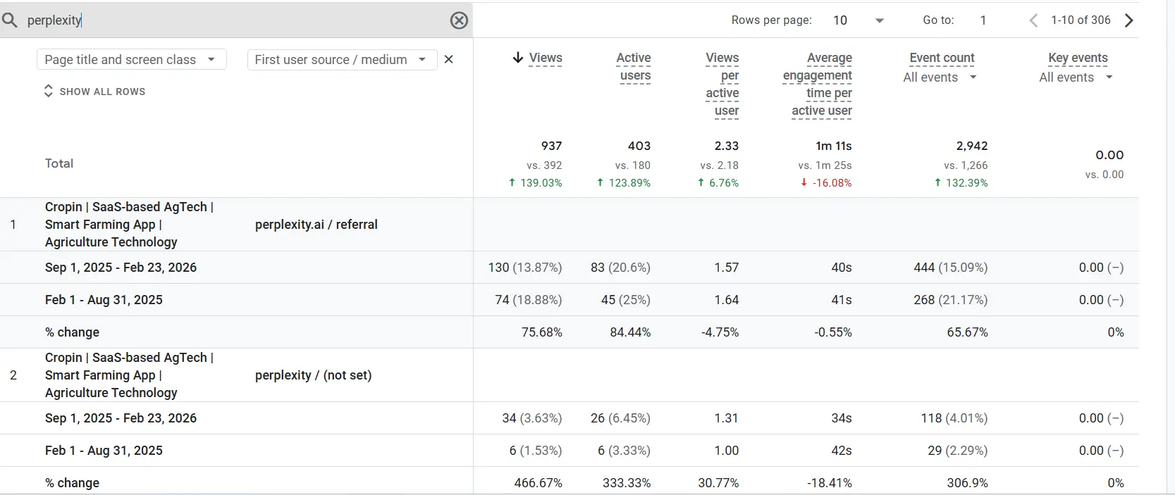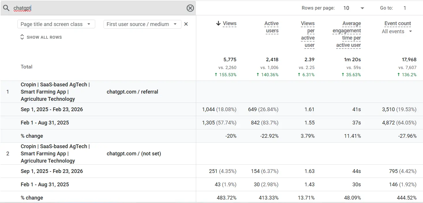 From September 2025 to February 2026, Cropin received a high number of views and active users via ChatGPT, maximizing their website engagement. The website received a total of 1,044 views and 649 active users from the ChatGPT responses. The number of views per active user was at 1.61, an increase of 3.79%. The average engagement time per active user went from 37 seconds to 41 seconds as well.