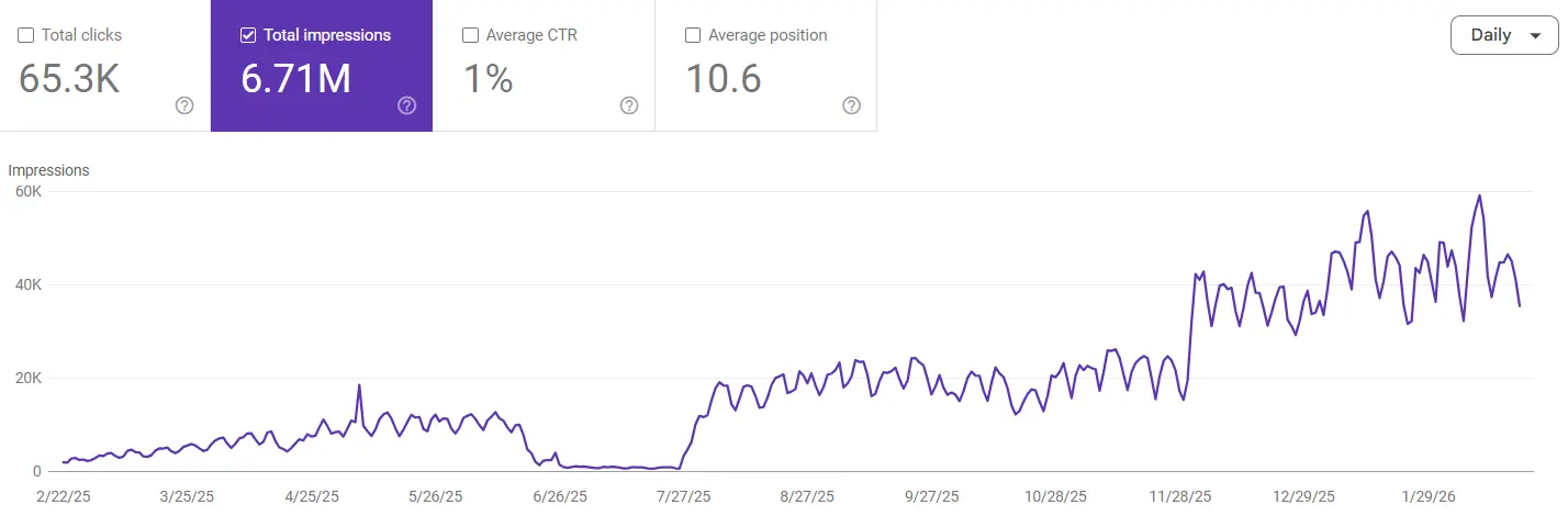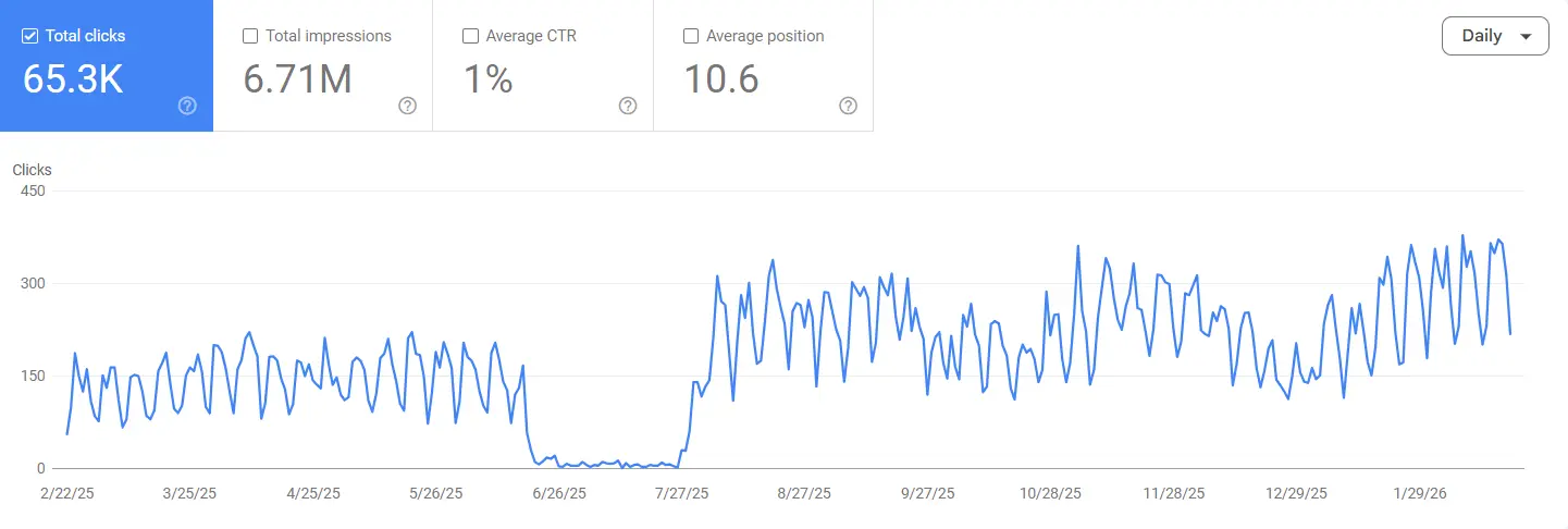 From August 2025 to January 2026, there have been visible results in terms of metrics. The structured SEO, technical corrections, and commercial keyword strategy improved website performance significantly.