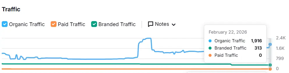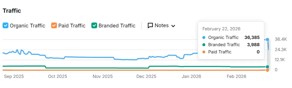 Cropin’s worldwide organic traffic achieved remarkable numbers, according to the Semrush data of the past 6 months, from September 2025 to February 2026. The traffic steadily increased upwards, and by February, the organic traffic reached 36,385, indicating the growing popularity of intent-driven search. Whereas Cropin’s branded traffic stayed consistent at 3,988 throughout.