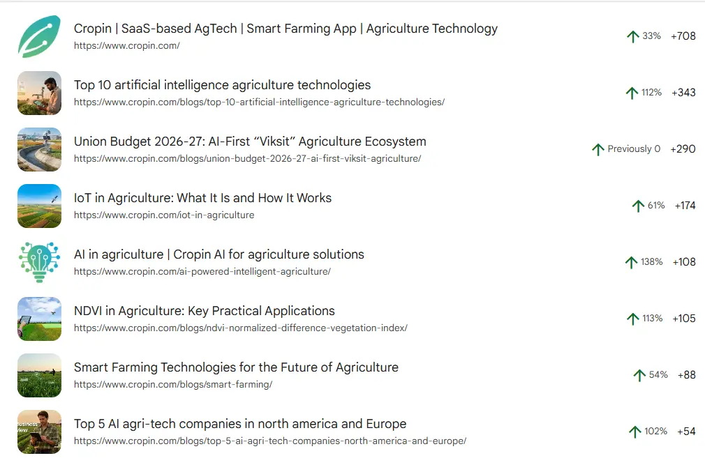 Overall, Cropin’s partnership with Webomindapps from the past 6 months resulted in strong global search visibility, rising international demand for AI-driven agriculture content, and better keyword performance.