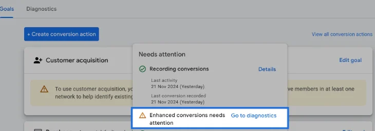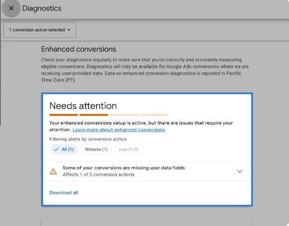 This alert appears when Google detects that your Enhanced Conversions setup is active, but not fully working as it should. The most common issue is: